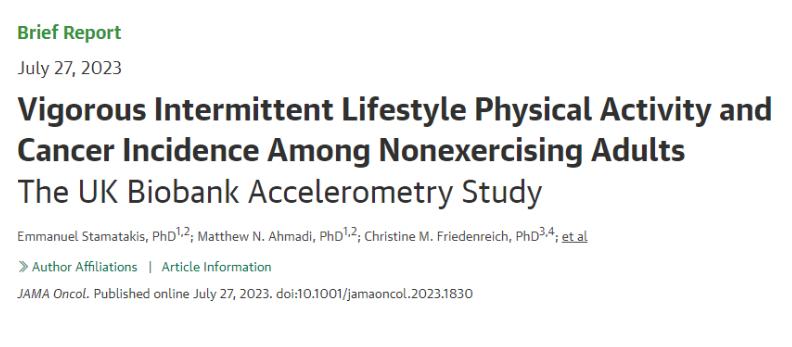 無獨有偶,《美國醫學會雜誌腫瘤學》上也曾發表過一項涉及22398名平均年齡62歲的受試者研究,通過收集受試者每日的運動量分析每日短暫間接性劇烈運動與癌症發生之間的劑量反應關係。