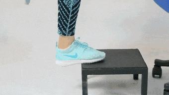 動作一:找一個穩固的臺階或凳子,前腳掌踩在上面,後腳跟懸空做快起慢落的練習。