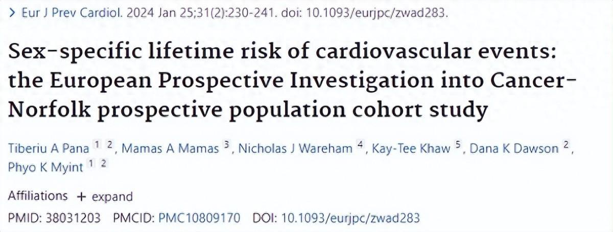 研究納入來自歐洲諾福克癌症前瞻性調查中的約2.4萬名參與者,平均年齡59.2歲,隨訪26.2年。研究人員分析發現,與女性相比,男性心血管疾病終身絕對風險高11.5%(男性爲68.9%,女性爲57.4%),且心梗一直是男性心血管首發疾病,直到80歲;而女性中,60歲後心血管首發疾病主要以房顫和腦卒中爲主。