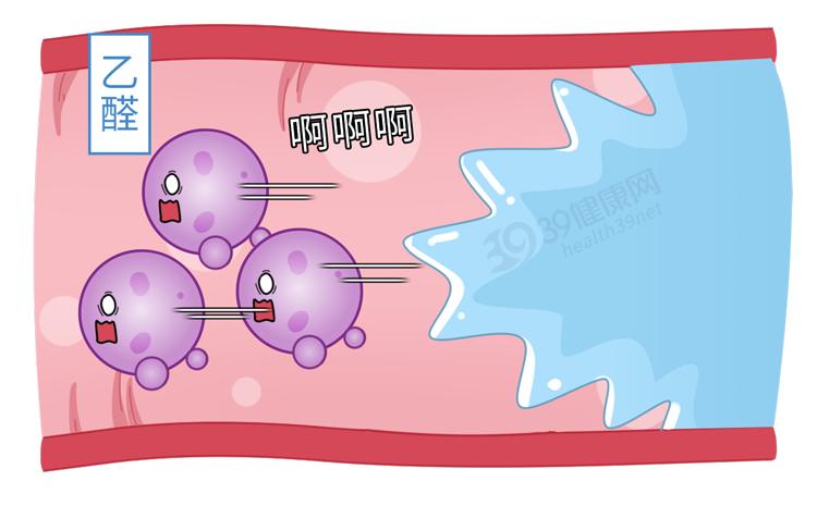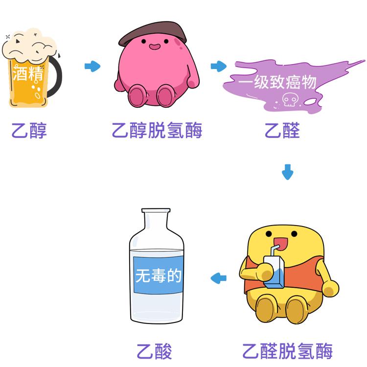 當酒精進入人體後,它會在肝臟中先後被代謝成爲高毒性的乙醛、無害的乙酸以及水和二氧化碳。