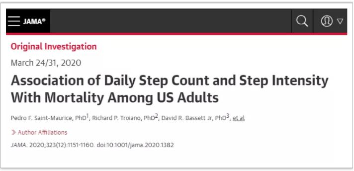 而發表在《美國醫學會雜誌》上的一項研究,通過對4840名40歲以上的美國成年人進行了長達十年的追蹤隨訪,結果發現正常人羣每天走8000—12000步最好,即便步數再增加全因死亡風險也不會再降低了。