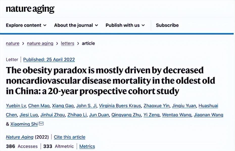 研究發現,中國80歲及以上的老人,超重到輕度肥胖範圍內(即BMI在24.0~31.9之間),其壽命最長。這一羣體的全因死亡率以及心血管/非心血管疾病死亡率也最低。