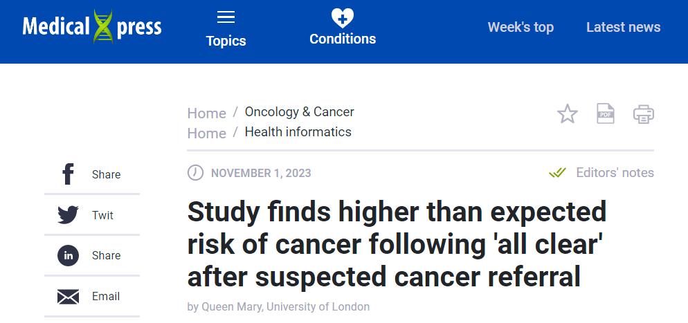 爲了研究疑似患癌者未來患癌的風險,英國倫敦瑪麗女王大學的研究人員對英國一數據庫中超100萬名患者的信息進行了分析,並與英國國家癌症診斷數據聯繫起來,提取了2013~2014年8類常見癌症轉診數據,涵蓋乳腺、婦科、頭頸部、上下消化道、肺、皮膚和泌尿系統的惡性腫瘤。