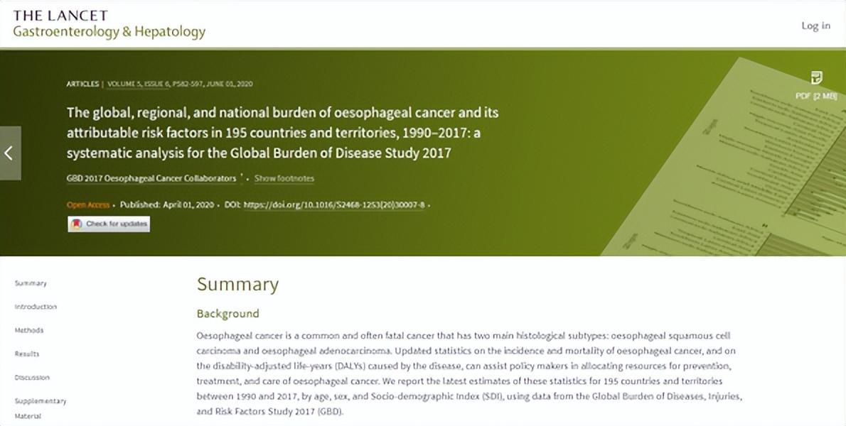 2020年,著名期刊《柳葉刀·胃腸病和肝病學》上發表過一項涉及全球195個國家地區食管癌發病率、死亡率以及可歸因風險因素等的統計研究。