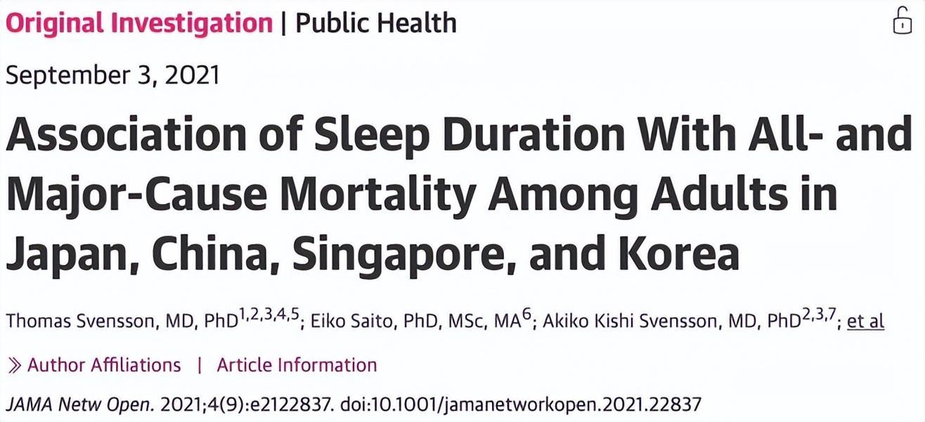 2021年,《美國醫學會雜誌》網絡期刊發表的一項研究揭示了日本、中國、新加坡和韓國成年人的睡眠時間與總體死亡率之間的關係。該研究發現,持續的睡眠不足和持續的睡眠過多都與死亡率升高相關,而7小時被認爲是“最佳睡眠時間”。