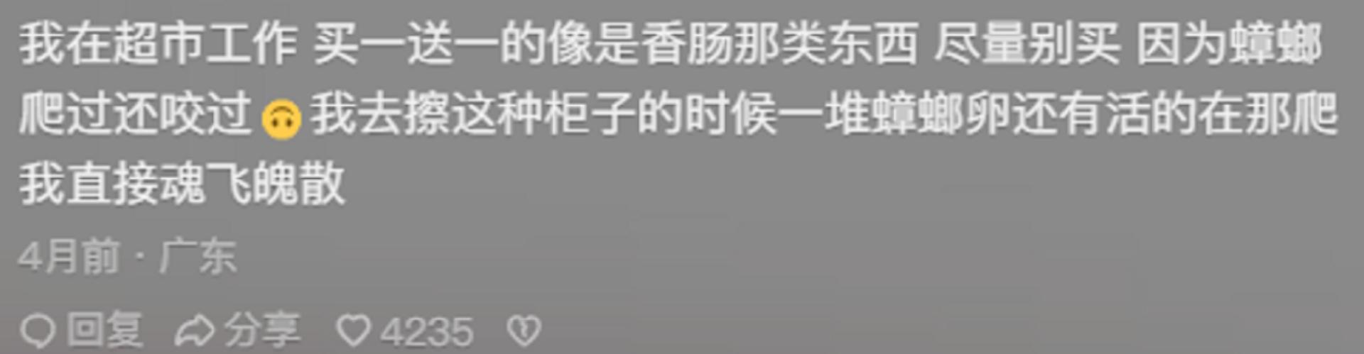 “我在超市打過工,告訴你們臘腸千萬別買,曾經打掃過儲藏櫃,上面一堆蟑螂卵,臘腸都是被蟑螂啃咬過的。”