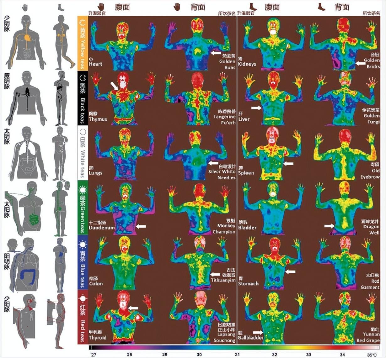 爲了驗證這個結果,研究人員分別選取了一些個體重複喝茶報告喝茶的感受,還讓24位體感通透的志願者參與實驗。在不告知受試者飲用什麼茶的前提下,讓他們記錄下身體發熱的部位。