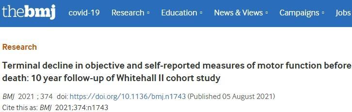《英國醫學雜誌》上曾發表過一項研究,研究稱人在65歲左右開始,會有明顯的運動機能下降,與之而來的是死亡風險增加。而這些運動機能衰退,會在死亡來臨之前的10年前就有所徵兆。
