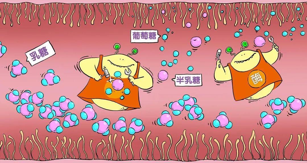 但乳糖不耐受人羣體內缺少乳糖酶,當大量牛奶進入小腸後,僅有的乳糖酶會將牛奶中的乳糖分解成葡萄糖和半乳糖。