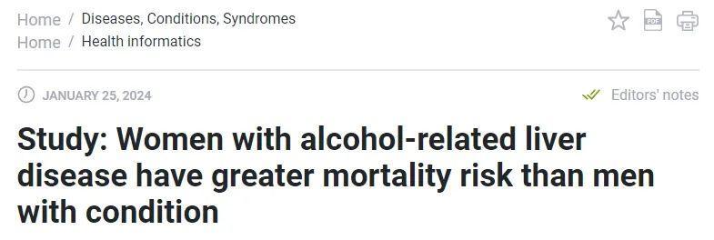 近日,一項發表在《肝病學雜誌》上的研究發現,在酒精相關脂肪肝病患者中,女性一定時間內的死亡風險是男性患者的1.6倍。