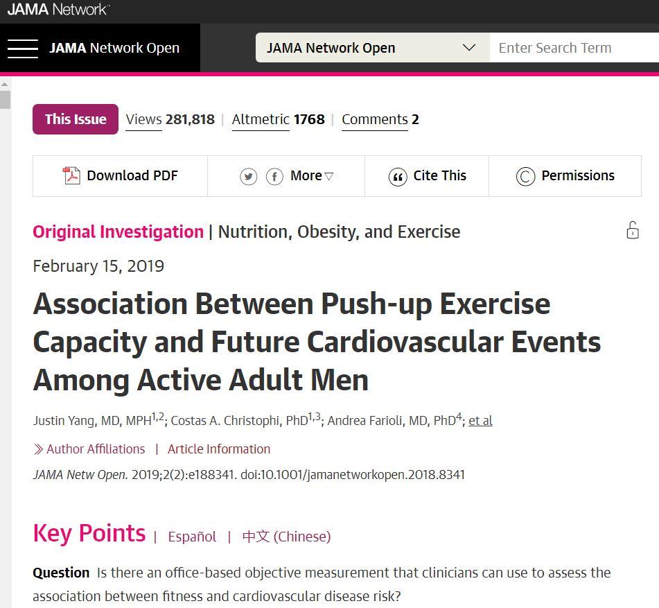 哈佛大學研究團隊曾進行過一項研究,研究納入了1104名平均BMI爲28.7的男性消防員,分別讓受試者進行一項俯臥撐能力測試,以每分鐘80次的節奏進行,直到跟不上節奏爲止,之後進行了10年的隨訪。