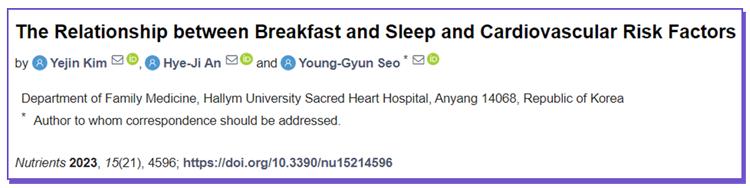 [3]Kim, Y.; An, H.-J.; Seo, Y.-G. The Relationship between Breakfast and Sleep and Cardiovascular Risk Factors. Nutrients 2023, 15, 4596.