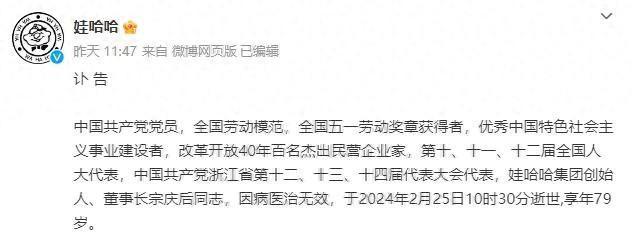 近日,娃哈哈官方發佈訃告,娃哈哈集團創始人宗慶後因病去世,享年79歲。早在2月22日,浙江當地醫院就曾向媒體披露宗慶後在院內ICU病房救治,情況穩定。但距離消息發出不足3天時間,他就被宣佈搶救無效離世。