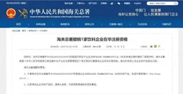 2月26日,國家海關總署在官網公佈:經覈實,在華註冊編號爲CUSA24092203180057的美國飲料生產企業JERRY&SONS PHARMACEUTICAL INC在申請註冊時提供了虛假材料。海關總署根據《進口食品境外生產企業註冊管理規定》有關規定,已撤銷該企業在華註冊資格,並未發現上述企業的產品報關記錄。
