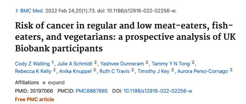 Risk of cancer in regular and low meat-eaters, fish-eaters, and vegetarians: a prospective analysis of UK Biobank participants, 2022 Feb 24