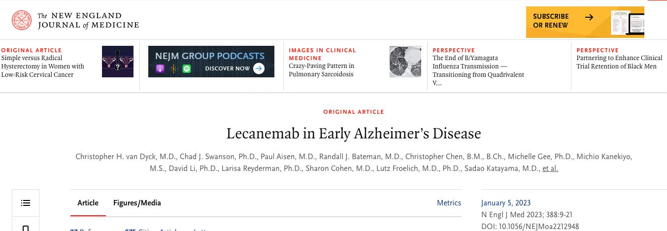 2022年11月29日,美國耶魯大學、華盛頓大學、南加州大學的研究人員在《新英格蘭醫學雜誌》(NEJM)上發表了一篇題爲" Lecanemab in Early Alzheimer’s Disease "的研究論文。