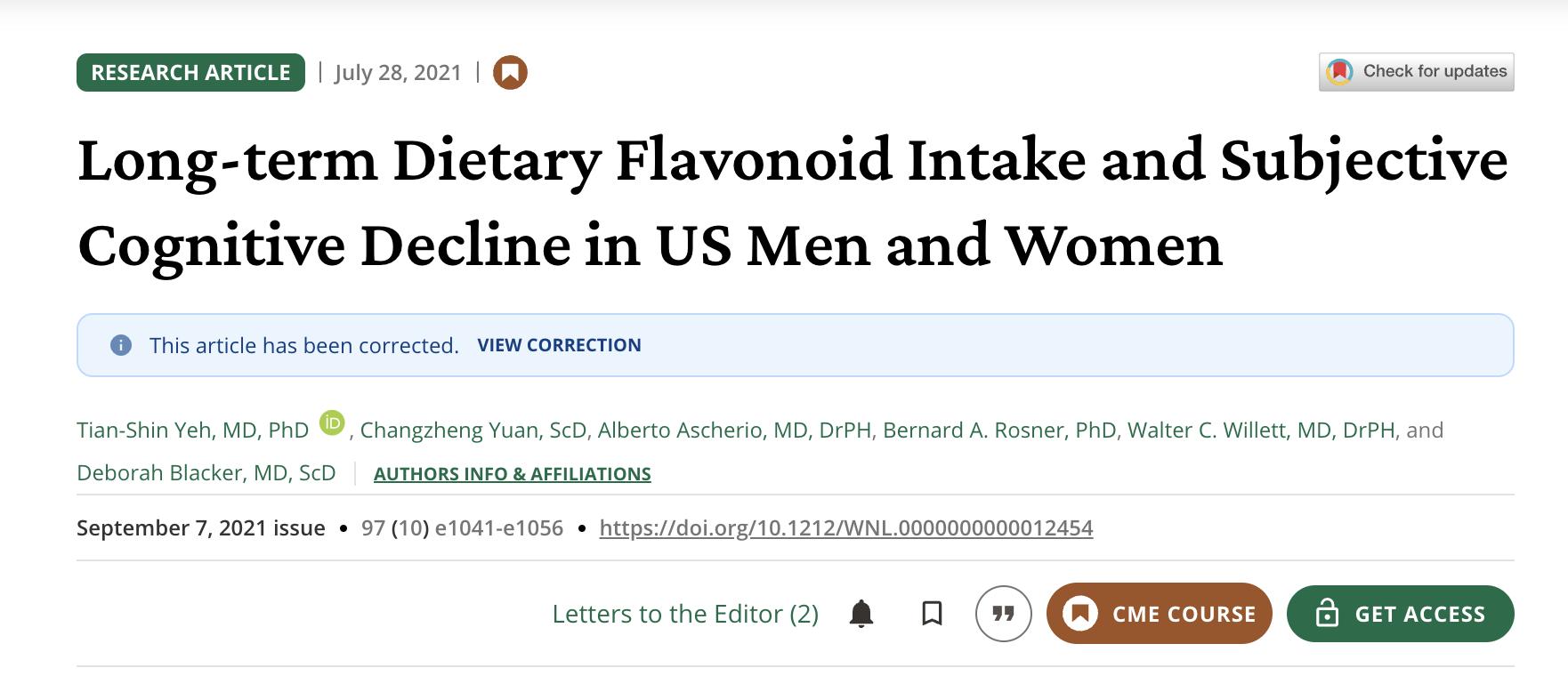 [1] Tian-Shin Yeh , Changzheng Yuan , Alberto Ascherio ,et al, Long-term Dietary Flavonoid Intake and Subjective Cognitive Decline in US Men and Women,Neurology. 2021 Sep 7;97(10)