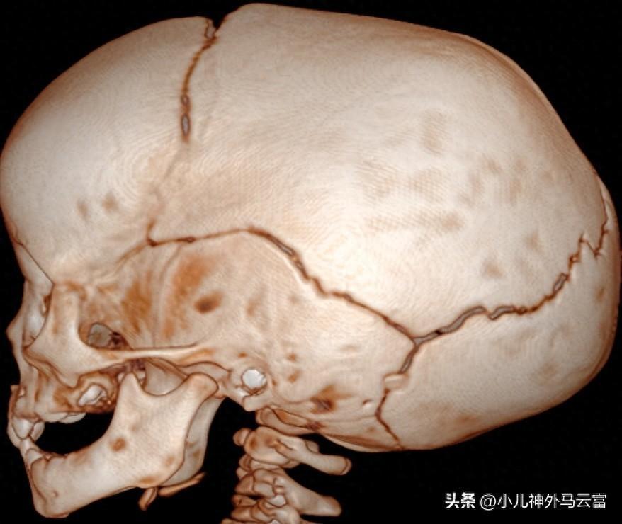 CT的影像學特點:CT檢查可以明確顱骨顱縫的一般情況。平掃可瞭解顱骨的完整性及部分顱項縫,如人字縫、冠狀縫、額縫。矢狀面、冠狀面掃描可以瞭解矢狀縫情況。