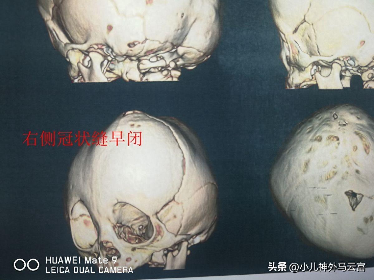 斜頭畸形 又稱偏頭畸形,是單側冠狀縫骨化所致的額骨單側發育不全,約佔4%。顱骨雙側生長不對稱,病變側額骨扁平後縮,眶上緣抬高後縮。病變側影響腦組織發育,前囟仍存在,但偏向健側。過早閉合骨嵴可在額中部觸及。額骨的不對稱牽動着整個顱穹窿形態,矢狀縫向病側偏位,健側額骨和頂骨呈過度膨出。單側冠狀縫的骨化可深入到翼點及顱底。因此,斜頭畸形幾乎均伴有面部不對稱畸形,並隨年齡的增長而加重。雙眼間距變小,額部變狹窄。耳廓及外耳道亦可不對稱,但多不明顯,眶鼻部畸形較顯著。斜頭畸形多合併精神發育遲緩、齶裂、眼裂畸形、泌尿系統畸形及全前腦畸形等。