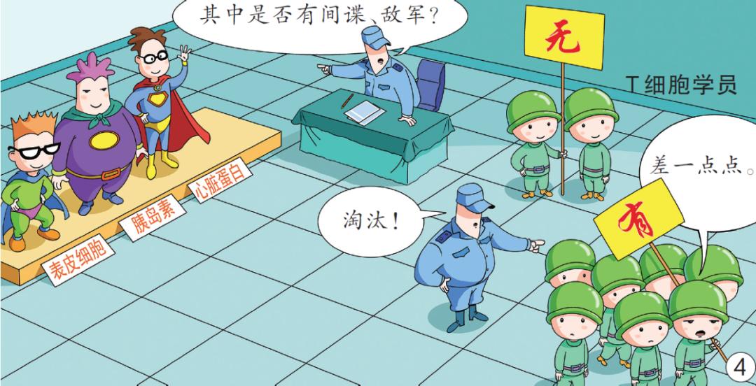 測試期間,胸腺中主持考試的教練細胞,會向學員展示所有被標記爲“自身”的蛋白質,包括那些通常只在心臟、胰腺、肝臟等器官中才能生成的蛋白質,以及各種激素如胰島素。一旦學員沒通過考覈,也會被直接淘汰。