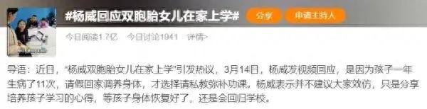 近日,“楊威雙胞胎女兒在家上學”的話題在社交媒體上引發熱議。體操奧運冠軍楊威在一條視頻中表示,孩子去年在家生病11次,大病三場,“三個娃的家庭,每次(孩子)生病就亂成了一鍋粥”,出於孩子和大人都需要休息的考慮,他才決定用私教補上孩子的功課。視頻中,楊威也表示,不建議大家效仿,一方面費用高昂,另一方面孩子在身體恢復後,還會迴歸學校。
