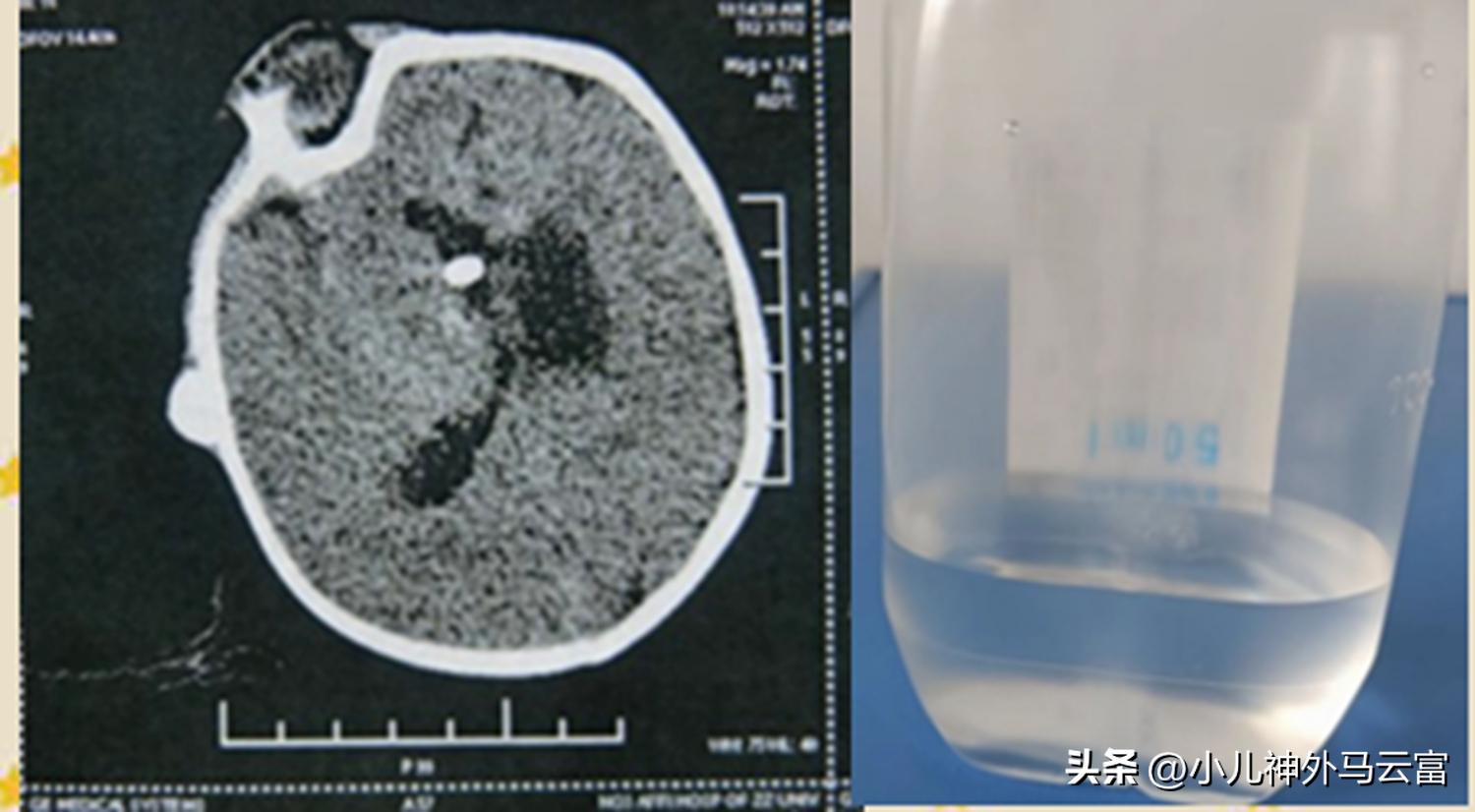 患兒CT圖及腦脊液圖,在兒內科治療的基礎上腦室腹腔外引流繼續進行(術後1複查頭部CT腦積水明顯減少,腦組織逐步恢復如下圖,腦脊液引流顏色逐步變清,每日引流量60-80毫升)