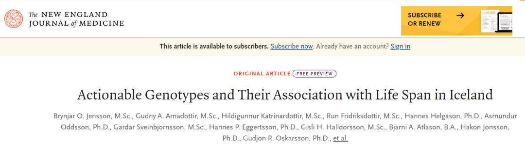 近日,deCODE Genetics公司等機構的科學家發表在醫學期刊《新英格蘭醫學雜誌》的一項涉及57933名冰島人的基因數據的研究指出,每25個冰島人當中就有1人攜帶美國醫學遺傳學和基因組學學院報告上的一種致病性或可能致病性基因突變,而這種基因與壽命縮短有關。