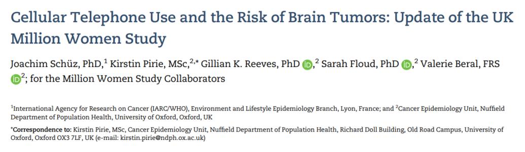 2022年3月29日,英國牛津大學與國際癌症研究機構在《美國國家癌症研究所雜誌》上發表的一項涉及英國百萬女性的研究結果顯示,使用手機不會增加腦腫瘤的發生風險。