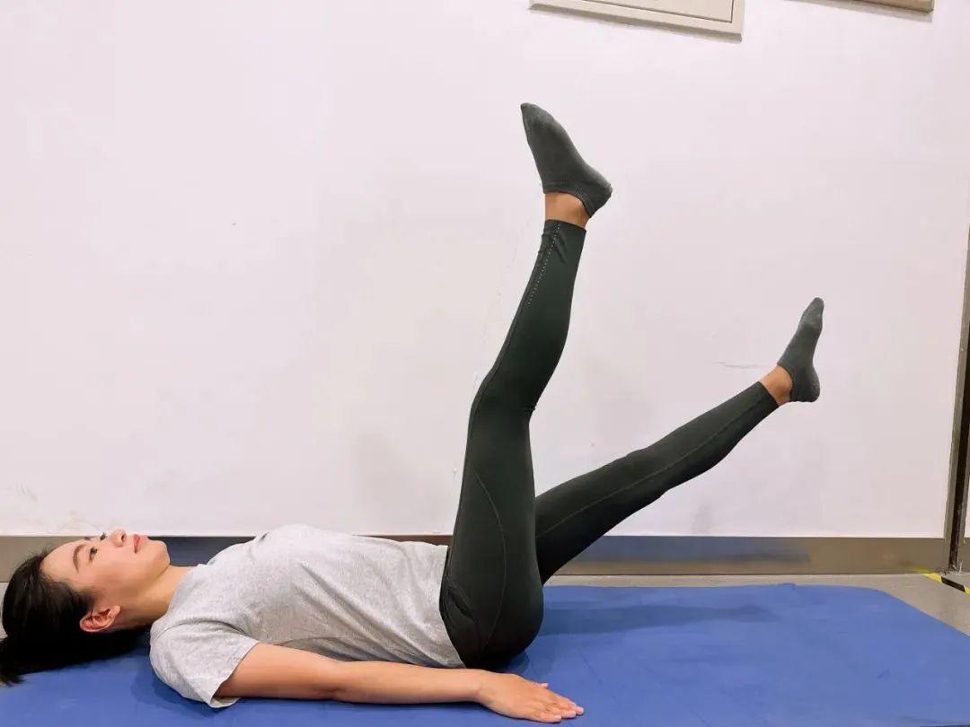 仰臥,雙腿伸直,雙臂放於體側;抬高雙腿與地面呈30度角;進一步抬高右腿,垂直於地面;然後返回起始位置;換身體另側做同樣動作;兩側交替做30秒鐘。