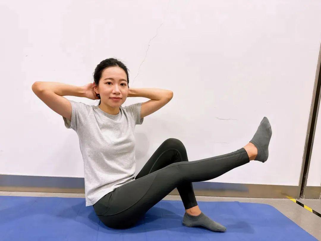 雙腳平放地面,雙膝彎曲,雙手放於腦後;用力擠壓腹肌,將左側肘關節靠向右側膝蓋,同時將右腳抬離地面;返回起始姿勢,換身體另側做同樣動作;每側身體各做5次。