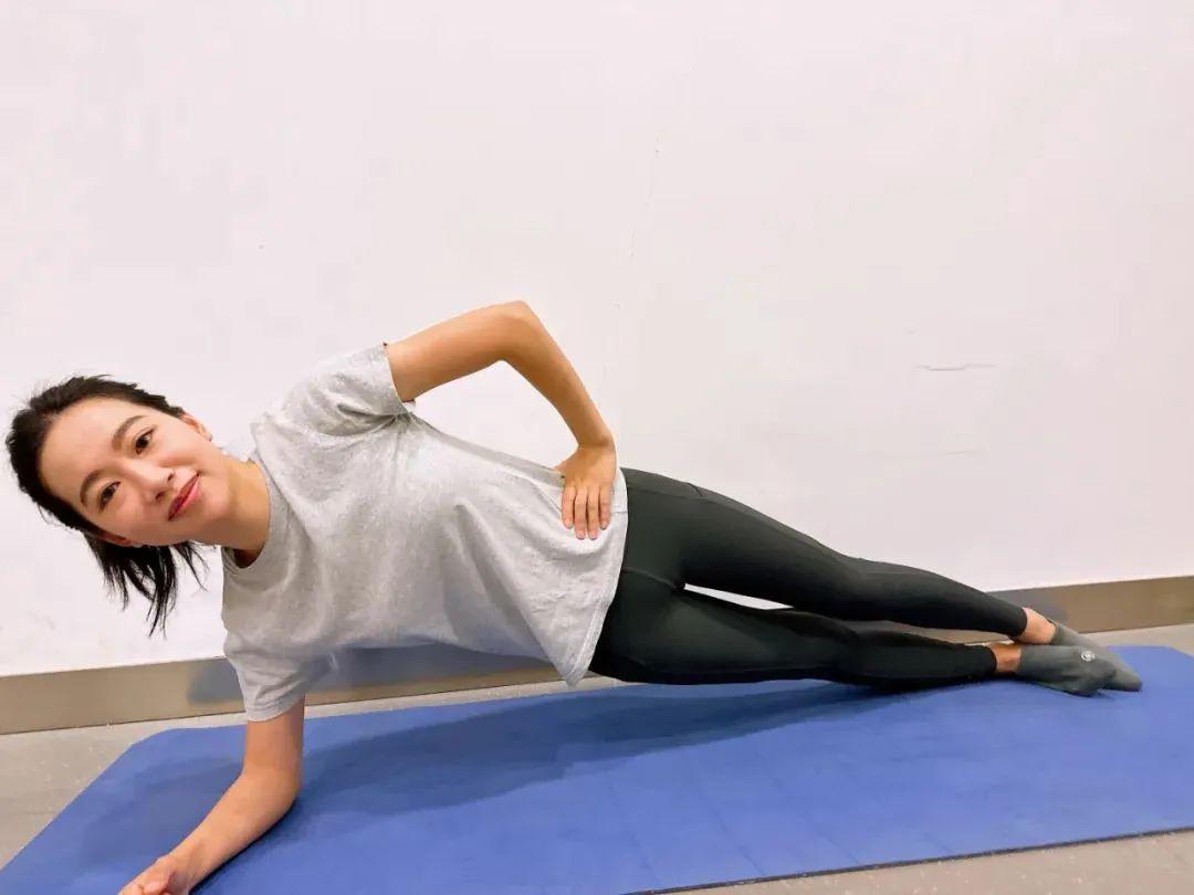右前臂和右腳支撐身體,左手叉腰,從頭到腳呈一直線;慢慢將上半身和臀部抬離地面,繃緊核心肌肉羣;保持此姿勢15~20秒;換身體另側做同樣動作。