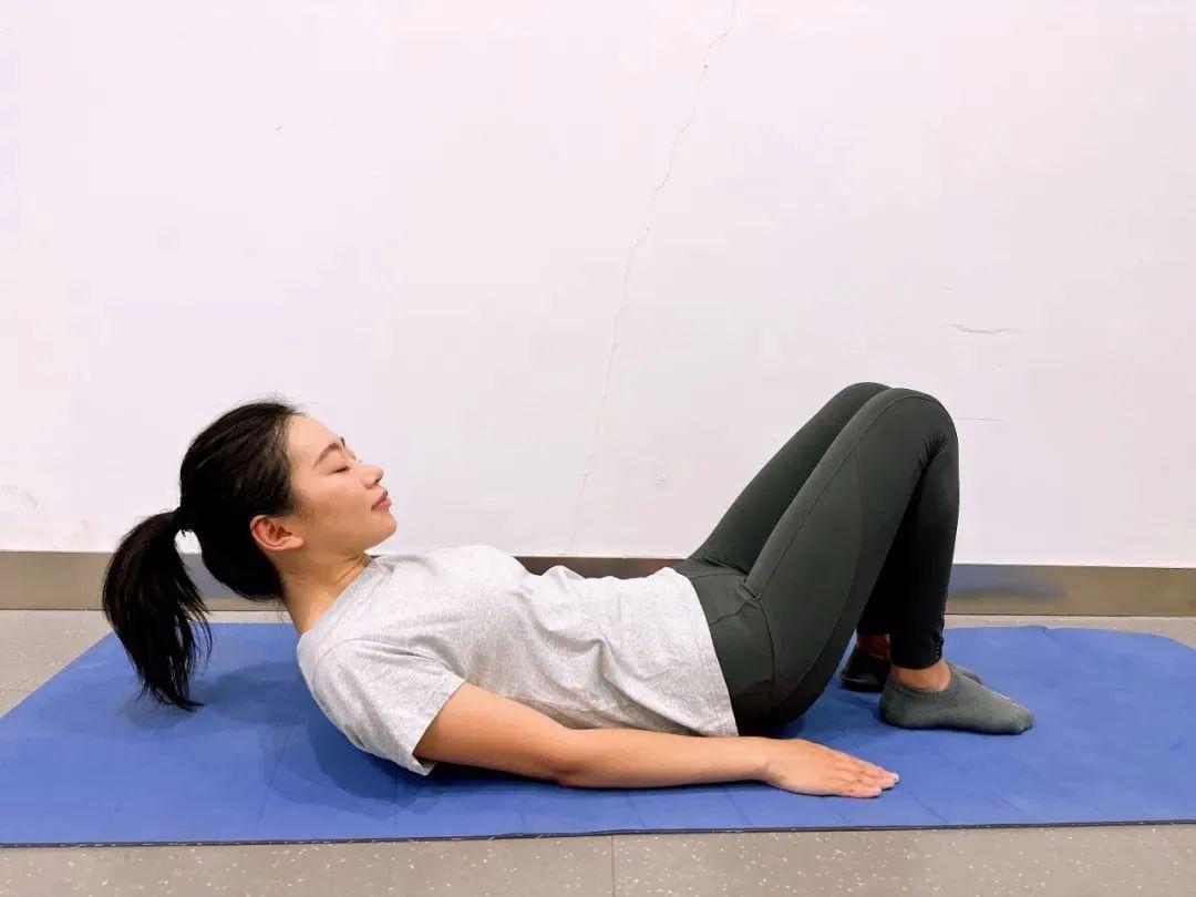 仰臥,雙膝彎曲,雙腳平放地面,兩腳與臀同寬;雙臂放於身體兩側,指尖指向腳趾;呼氣,收縮上腹部,依次將頭部、頸部、肩胛骨和上背部抬離地面約2~3釐米;吸氣,放低身體;重複做10次。