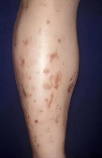 也叫脛前糖斑,表現爲小腿前側出現邊界清晰的褐色斑塊,不痛不癢,是糖尿病比較特異的皮膚病變。