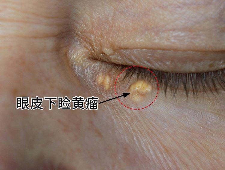 該症在中老年女性身上較爲常見,在上眼瞼內側會出現淺黃色的扁平苔蘚狀病變。這是因爲體內脂肪代謝異常,導致脂肪組織沉積在皮膚、肌腱位置所致。