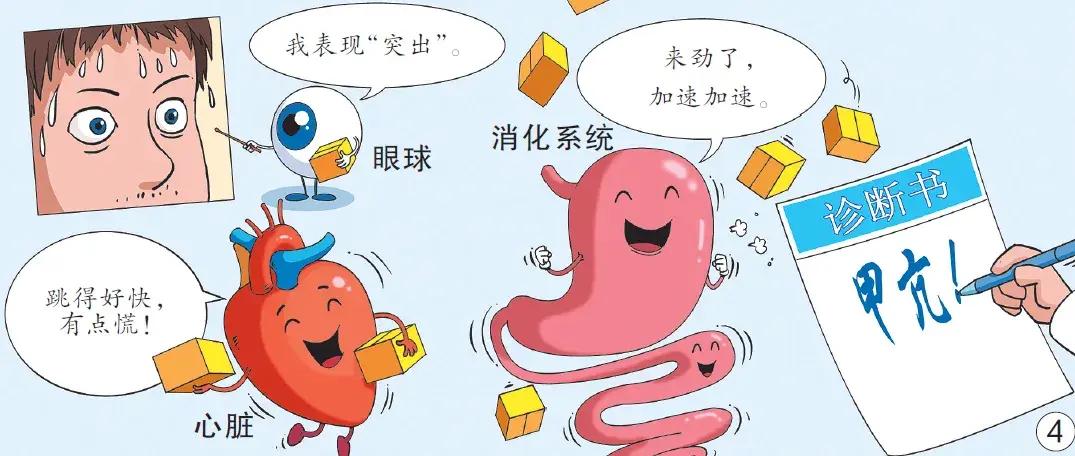此時,人會表現出精神緊張焦慮、怕熱多汗、眼球突出、心率快、多食易飢、腸蠕動加快等症狀。