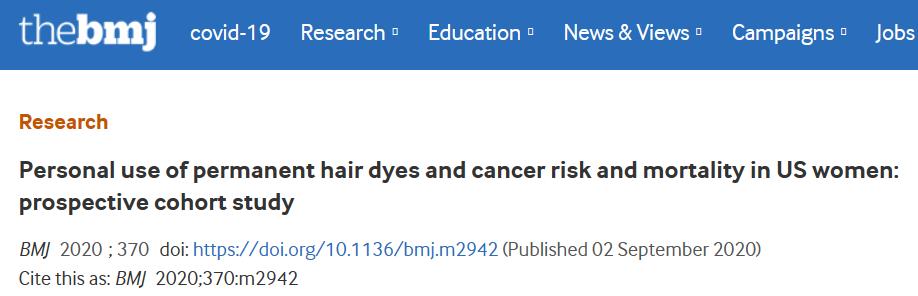 2020年《英國醫學期刊(BMJ)》就發表了一項相關研究,通過觀察使用永久性染髮劑的人羣在癌症發病、死亡情況的表現,沒有數據顯示使用永久性染髮劑與癌症風險和死亡率有密切的關係。