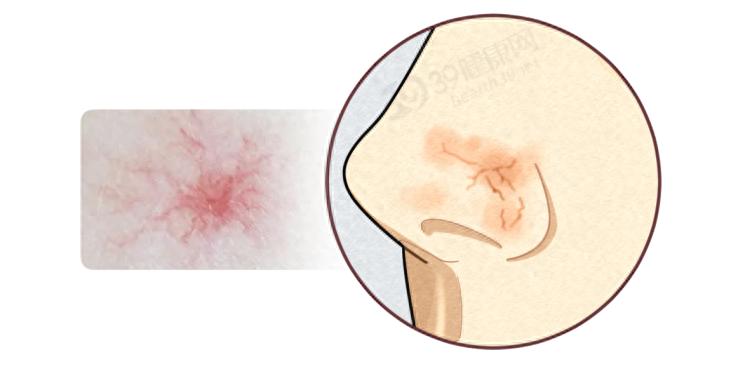 蜘蛛痣是指皮膚中心有個紅點,周圍有向四周放射的血管分支,因形似蜘蛛而得名。在按壓中心紅點後,周圍的血絲會消失,壓力消失後再次出現。