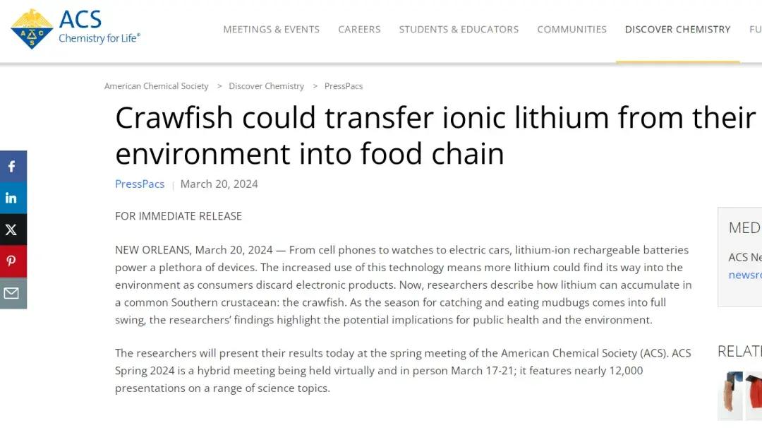 3月20日,在美國化學學會春季會議(ACS Spring)上,美國密西西比學院卡澤裏實驗室研究人員彙報的研究成果顯示,小龍蝦可吸收大量溶解在水中的鋰,從而累積在體內。