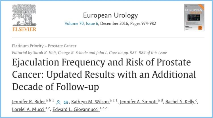 《歐洲泌尿外科》上刊登了一項由哈佛大學公共健康學院Jennifer R. Rider及其團隊發表的關於《前列腺癌症的排卵頻率和風險:十年隨訪的最新結果》的研究,該研究指出:每個月射精大於21次,可降低前列腺癌的發生率。