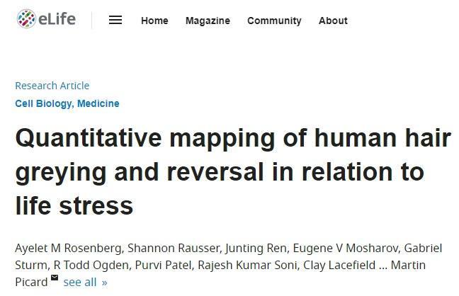 全球知名期刊《eLife》上刊登了一篇由美國哥倫比亞大學研究團隊發表的研究結論,論文中創立了一套針對人類頭髮變白程度的定量化數字系統,對受試者頭髮顏色進行監測,觀察其一年時間中的心理壓力水平。
