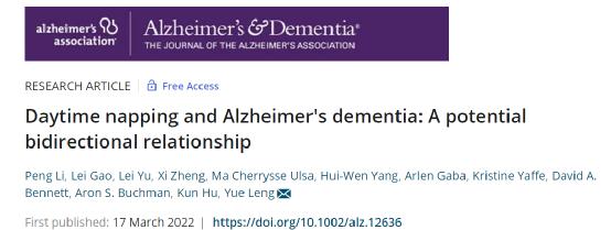 2022年3月,美國加利福尼亞大學的研究人員發表在《阿爾茨海默病與癡呆:阿爾茨海默病協會雜誌》期刊上的一項研究指出,午睡與大腦衰老之間存在雙向關係。