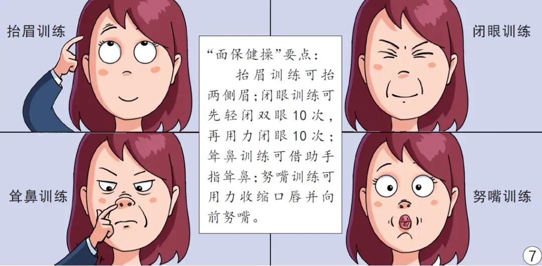 若想預防或延緩面肌萎縮可進行表情訓練,做“面保健操”,具體可進行抬眉訓練、閉眼訓練、聳鼻訓練和努嘴訓練等。▲