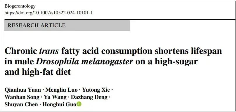 發表在國際權威期刊《生物老年學》上的這項研究,分析了在等熱量飲食下,增加反式脂肪酸攝入,對果蠅整體健康和壽命的影響。
