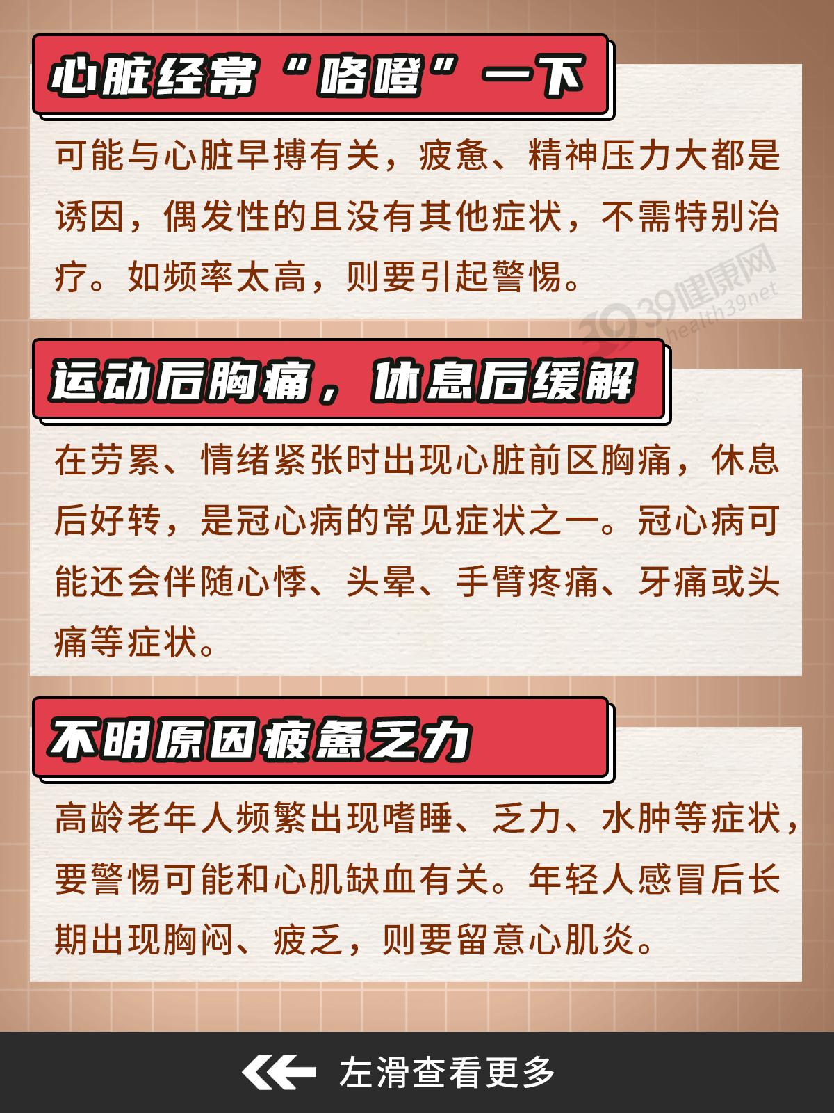 此外,出現這3種症狀,也不能大意,要及時就醫排查:心臟經常咯噔一下;運動後胸痛,休息後緩解;不明原因疲憊乏力。