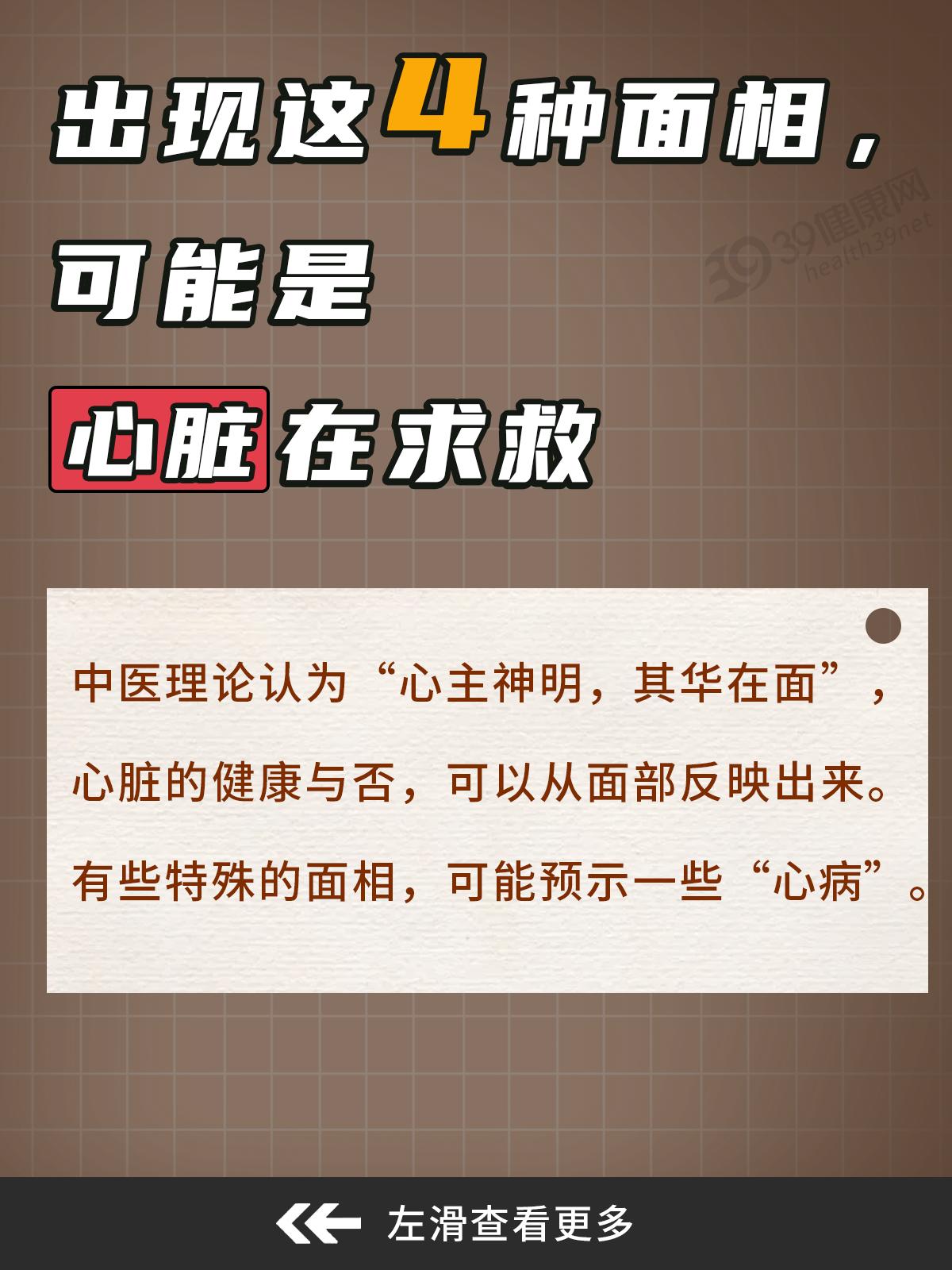 俗話說“相由心生”,當心髒出問題時,臉上可能會出現一些信號:瞼黃瘤、面色青紫、耳垂褶皺、鼻樑橫紋。