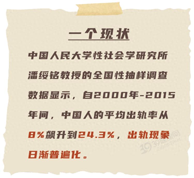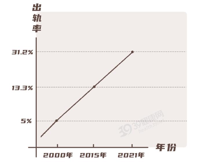 潘綏銘教授一項調查研究顯示:中國女性2000年婚外出軌率不到5%,2015年上升到13.3%,2021年高達31.2% 。