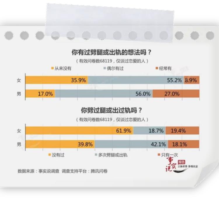 騰訊曾發佈過一份由7萬人參與的《中國人出軌態度調查報告》,結果顯示,約60%的男性曾經出過軌或多次出軌,而女性出軌率達38.1%。