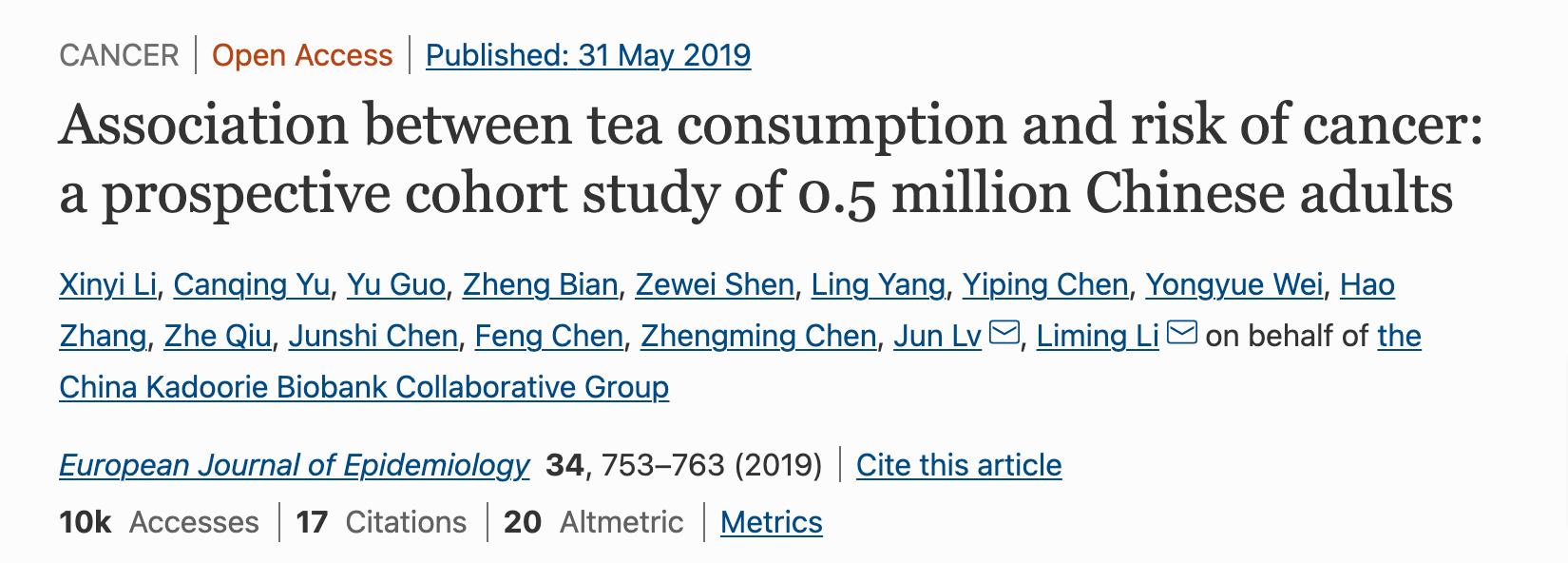 北京大學李立明教授領銜的團隊在《歐洲流行病學雜誌》上發表過一項研究,研究人員對50萬餘名國人數據進行了分析,分析喝茶與多種癌症發生之間存在的關係。對其中45萬餘人進行了10.1年的長期隨訪發現,喝茶與肺癌、胃癌、結直腸癌、肝癌、乳腺癌以及宮頸癌發生存在關係。隨訪過程中,共有22652例新發癌症。