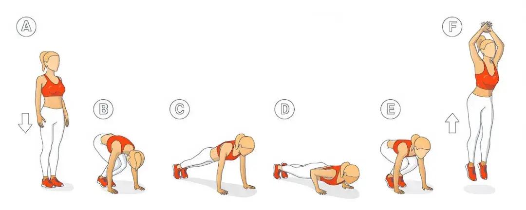 站立,雙腳與肩同寬,雙臂自然下垂;俯身下蹲,雙手掌撐地,用力將雙腿同時後蹬進入俯臥撐姿勢;完成一個俯臥撐後,將雙腿收回至下蹲姿勢;起身跳躍,同時雙臂向上舉過頭頂。