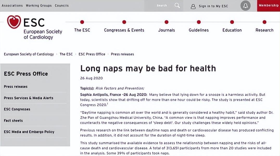 2020年,歐洲心血管學會年會公佈的廣醫一院的研究指出,午睡1小時或與更高的全因死亡風險、心血管疾病風險相關。該研究共納入20多個研究內的31.3萬餘名受試者數據,評估午睡與全因死亡風險、心血管疾病風險之間的關係。